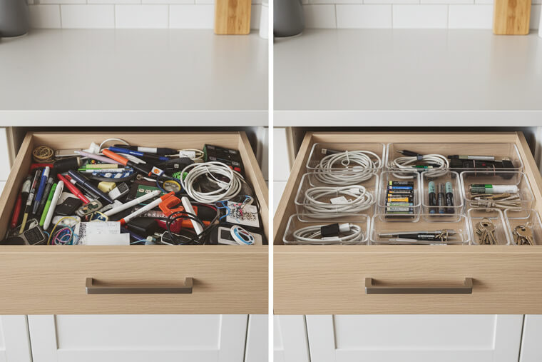 It's easy to open a drawer and feel overwhelmed by random cords, pens, and mismatched keys. But here's what most people don't know: clearing one drawer changes how your whole house feels. A cluttered drawer steals tiny minutes every day — hunting, untangling, and replacing things you think you've lost. Psychologists call this "decision fatigue"; small messes make your brain work harder. Smart alternative: pick one drawer, empty it, sort into three boxes (keep, toss, donate), then return only what fits neatly.